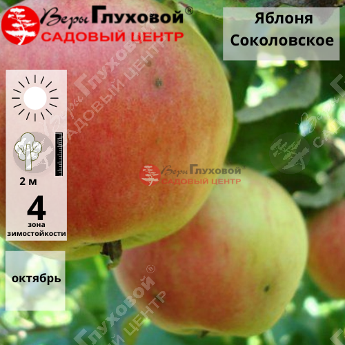 Высота дерева 1-2 м. Яблоки плоскоокруглые, средней величины, вес 200 г. Кожица тонкая, цвет желтовато-зеленый, сверху покрыт темно-бордовым румянцем. Мякоть плотная. Вкус кисло-сладкий. Сроки хранения до 120 суток. После прививки плодоношение наступает на 4 год. Самобесплоден. Сорта -опылители: «Подснежник», «Братчуд», «Ковровое».