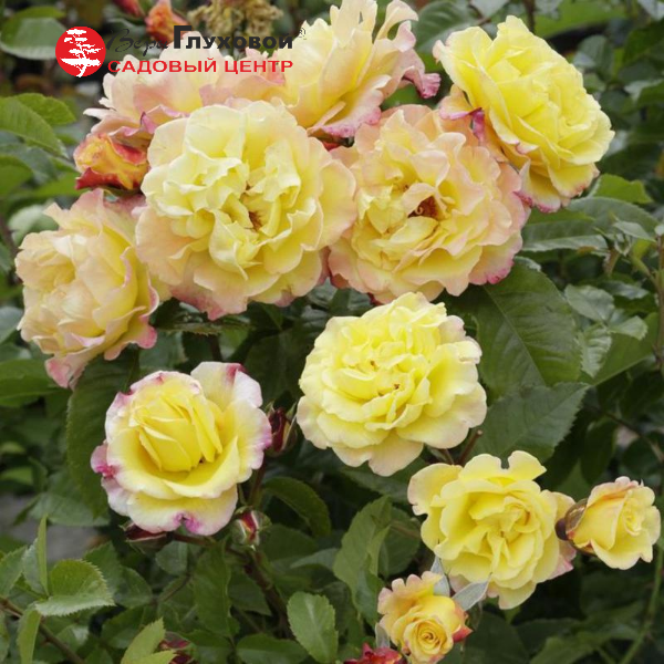 Бокаловидные бутоны яркие, алые, в роспуске цветки чашевидные, среднего размера (от 7 до 8 см), лимонно-жёлтого окраса, с красноватой каймой. Со временем они выгорают до кремово-розового цвета. Цветы собраны из 70-75 лепестков, являются густомахровыми. Многоцветковые соцветия формируются из 5-20 бутонов, источающих слабый аромат шиповника.